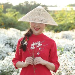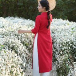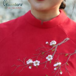 Áo dài Đông Phong vải nhung tăm thêu hoa mai trắng