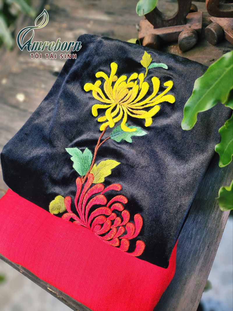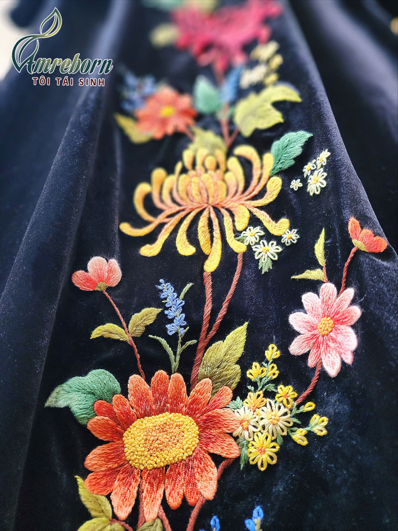 Áo dài nhung the dáng suông thêu tay hoa cúc tứ bình