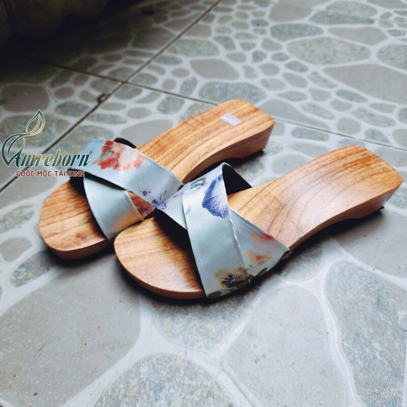 Guốc mộc quai lụa in hoa dáng chéo chữ X