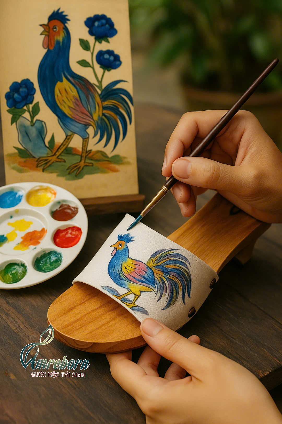 Guốc mộc vẽ tay tranh Đông hồ – Gà hoa hồng