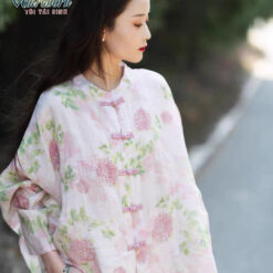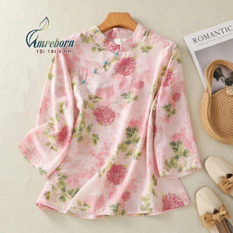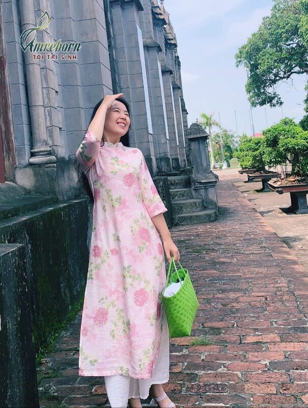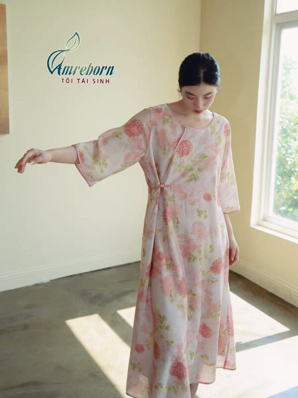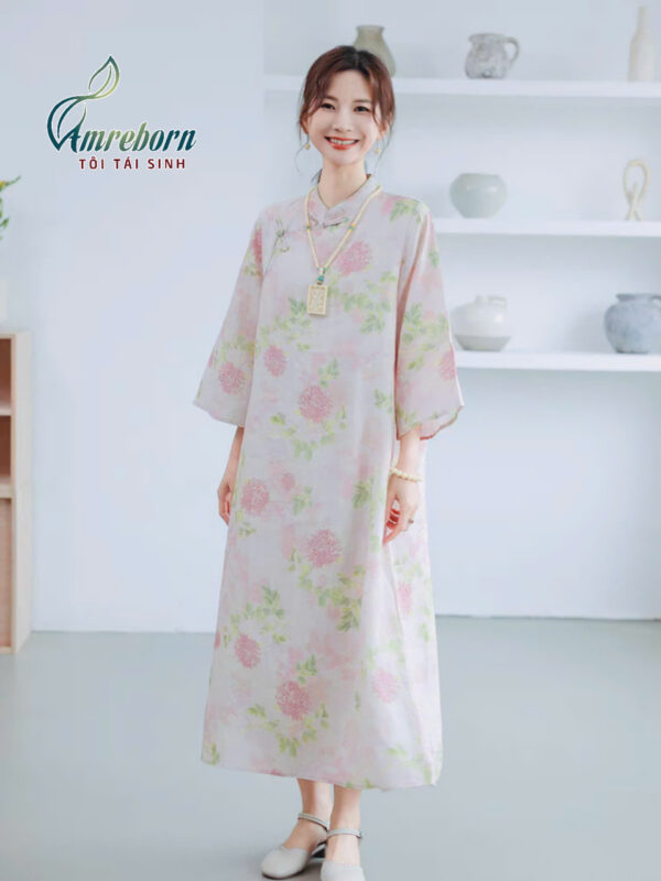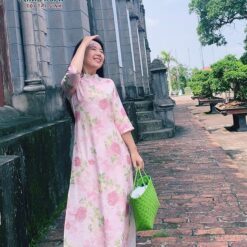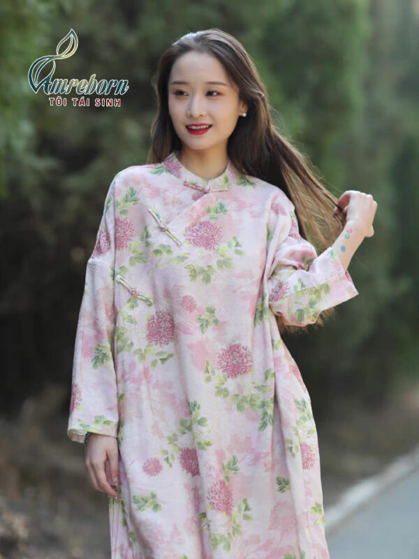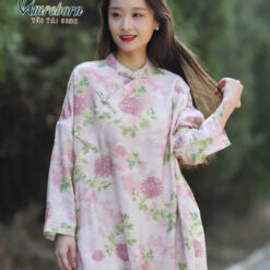 BST Váy áo dài cách tân hoa mẫu đơn hồng