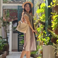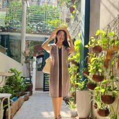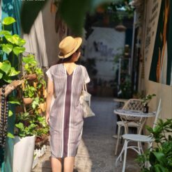 Váy chàm kẻ sọc cổ V dáng suông